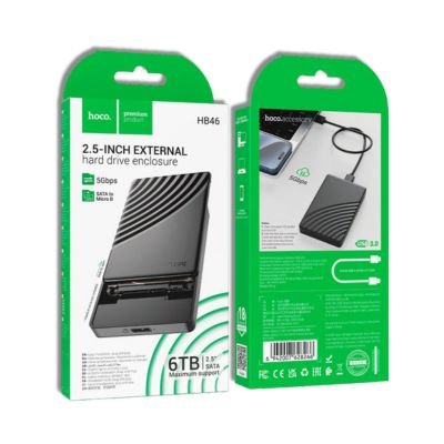 Carcasa externa Hoco HB46 para discos HDD/SSD de 2.5” con conexión USB 3.0 y velocidad de hasta 5 Gbps. Ideal para convertir tu disco en almacenamiento portátil de forma simple y rápida.