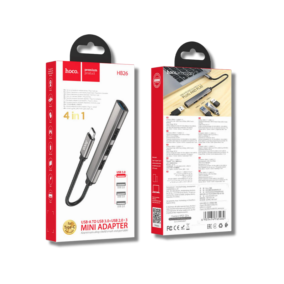 Hub Hoco HB26 4 en 1 Tipo C a USB 3.0 + 3 USB 2.0 – Funcional